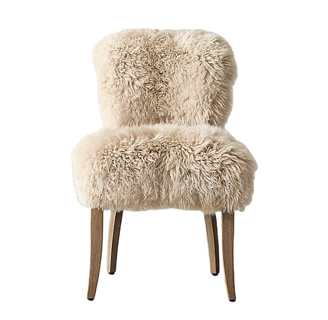 Our reproduction of a classic french style sherpa dining chair. Made of faux sheepskin and a solid wood frame, this chair is one of a kind.